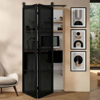 na fotografii jsou posuvné dveře prezentovány se systémem posuvných dveří Harmonika 1M a dveřní klikou Hans