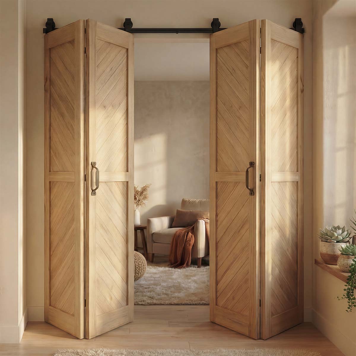 sada obsahuje čtyři křídla o šířce 50 cm, po použití harmonikového systému se křídla spojí a vytvoří funkční dvojité skládací dveře