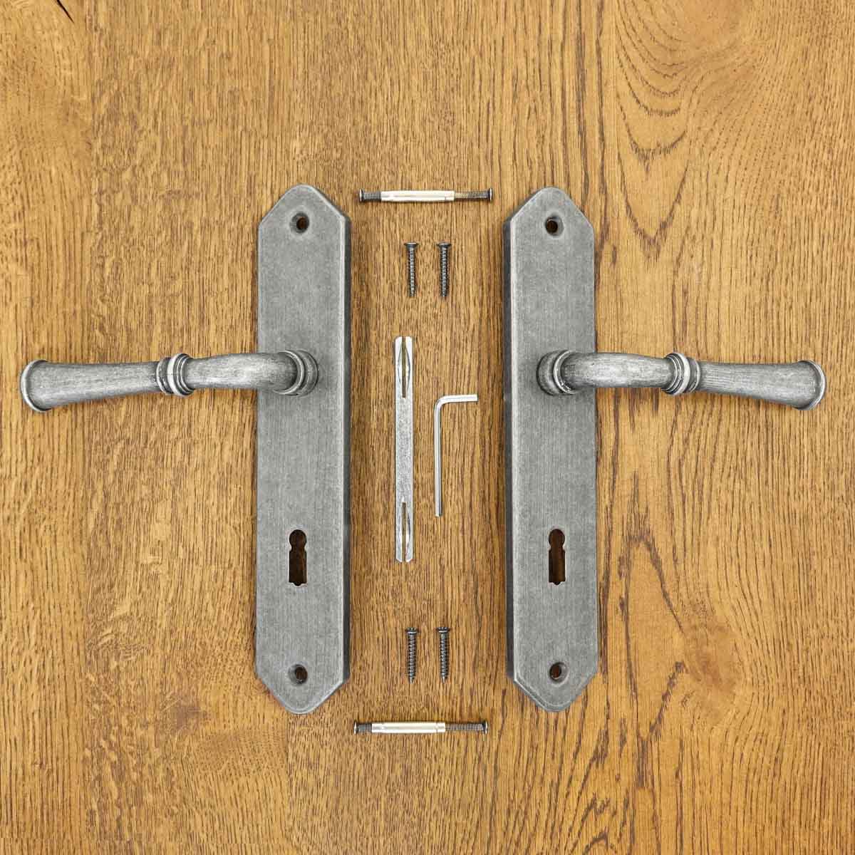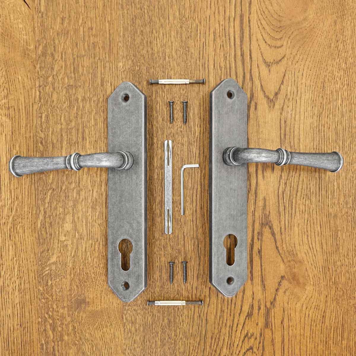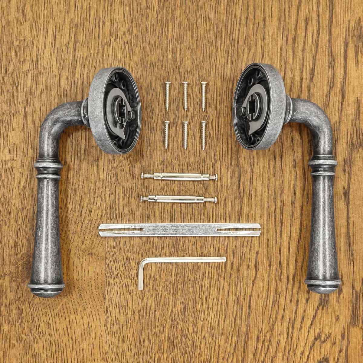 sada obsahuje dvě kliky (pro 1 dveřní křídlo), čep, montážní prvky