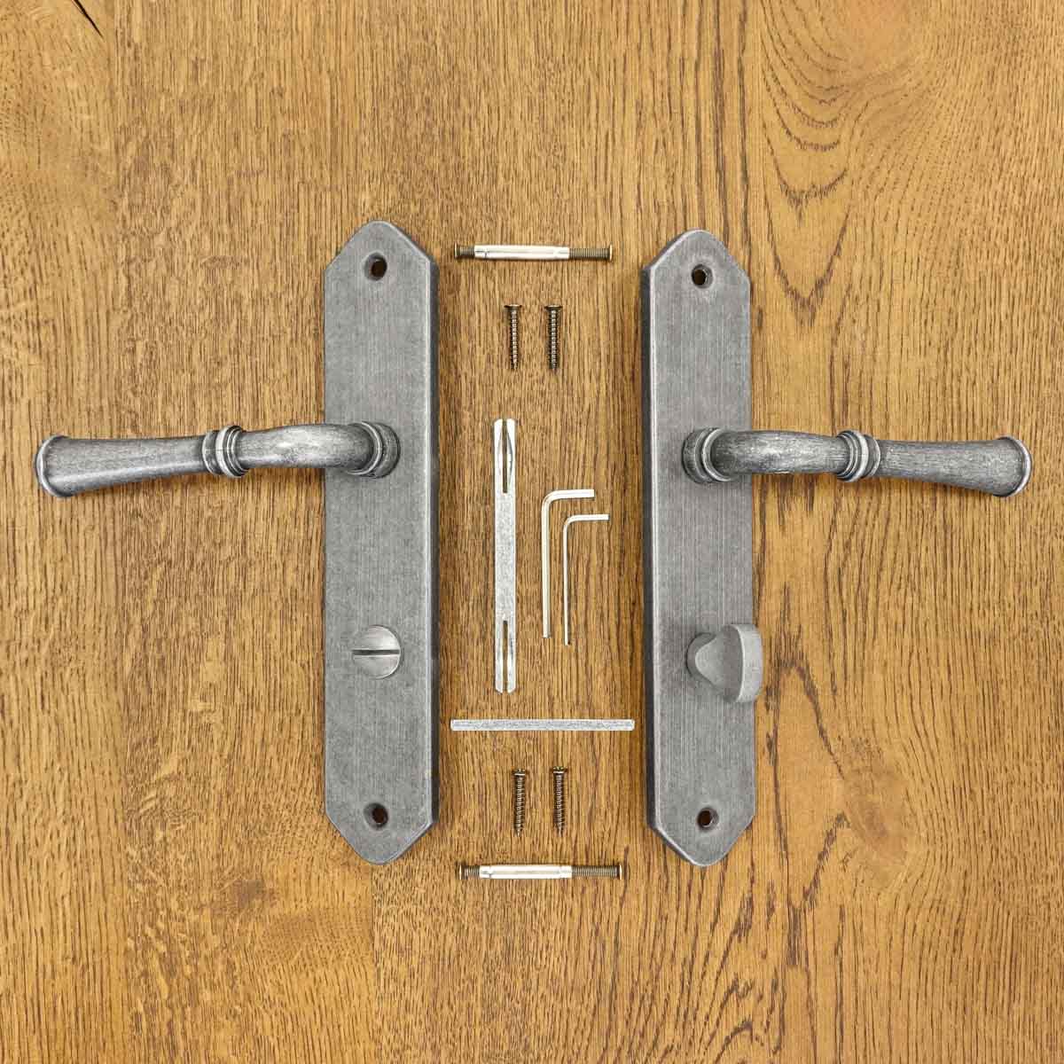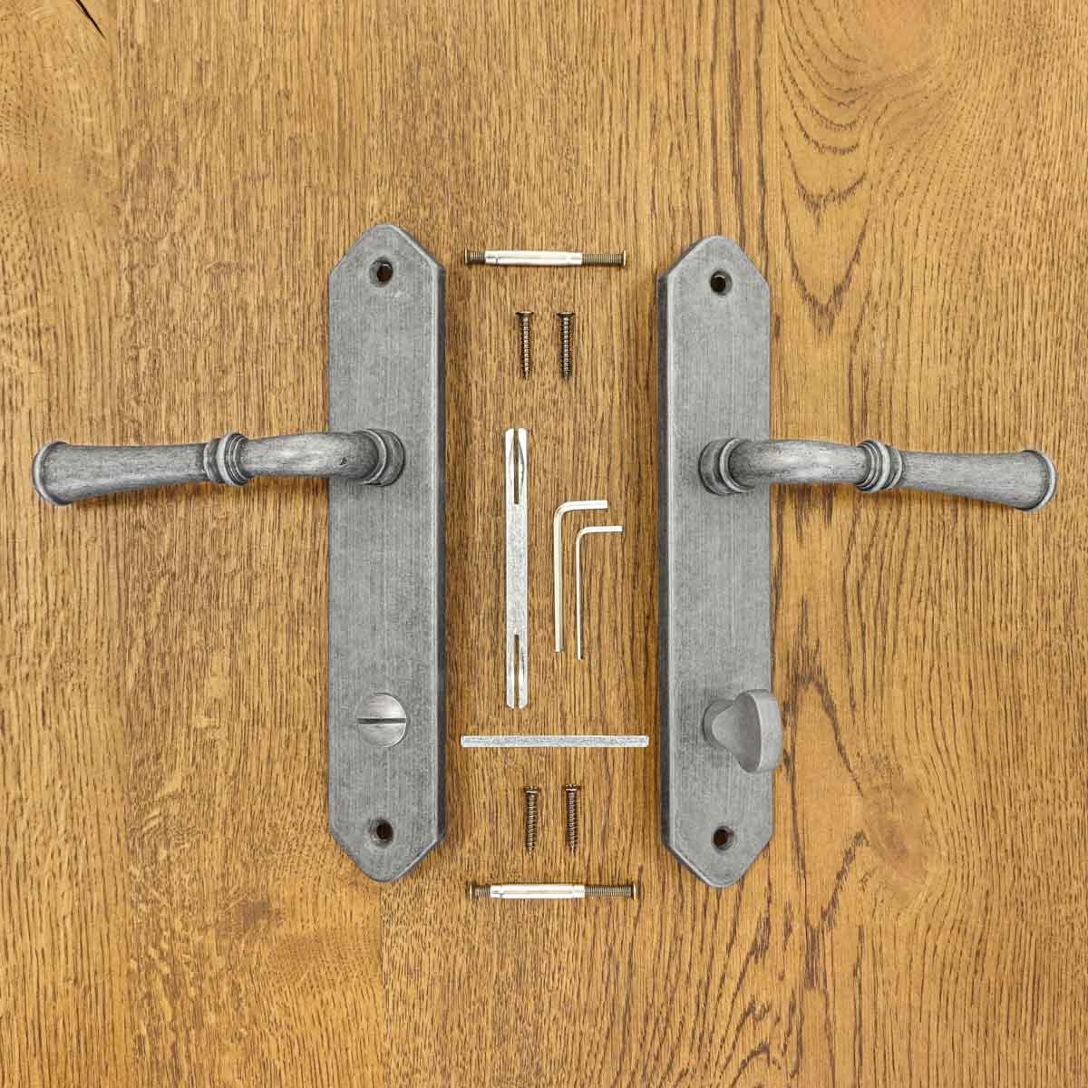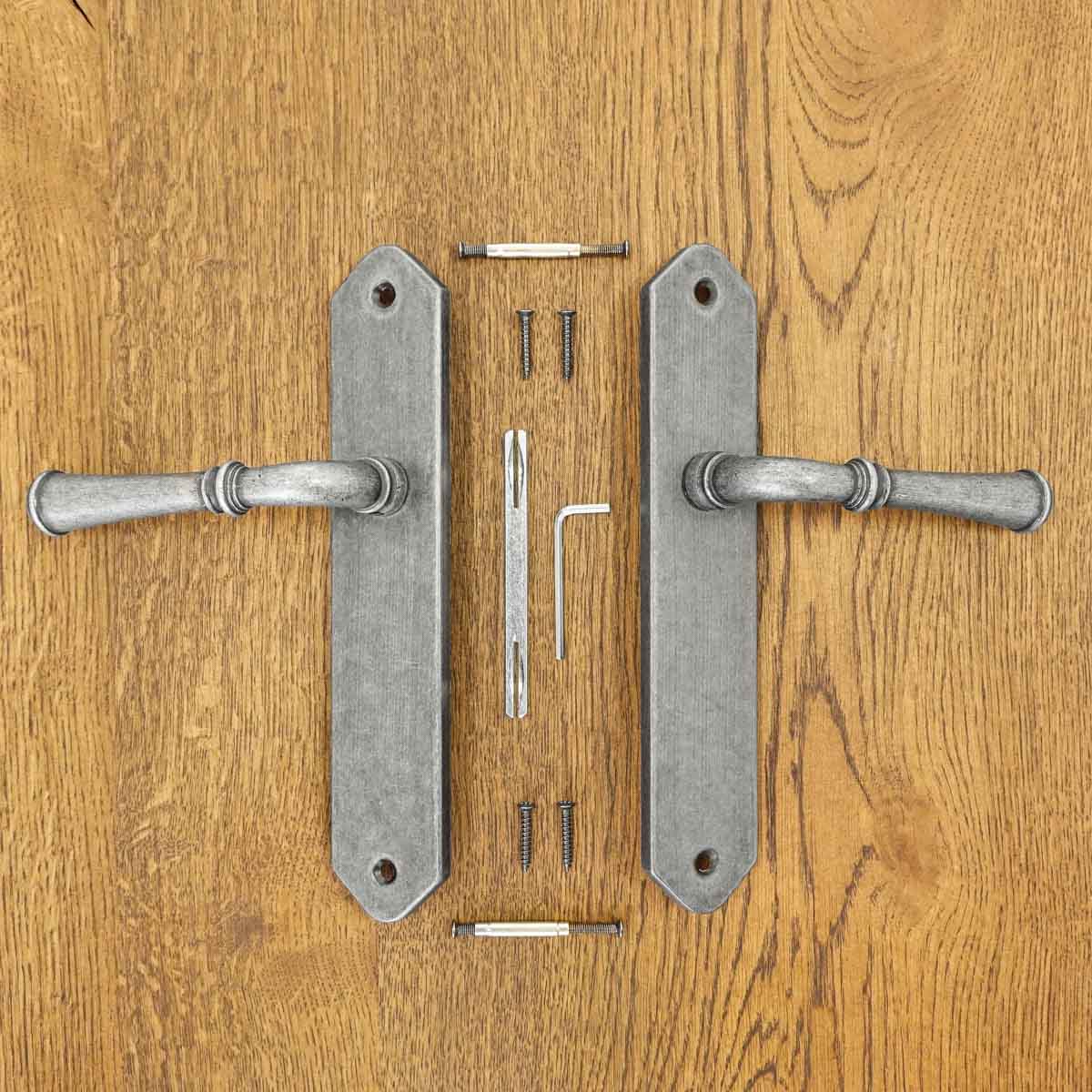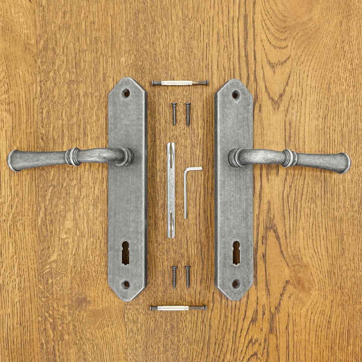 sada obsahuje dvě kliky (pro 1 dveřní křídlo), čep, montážní prvky