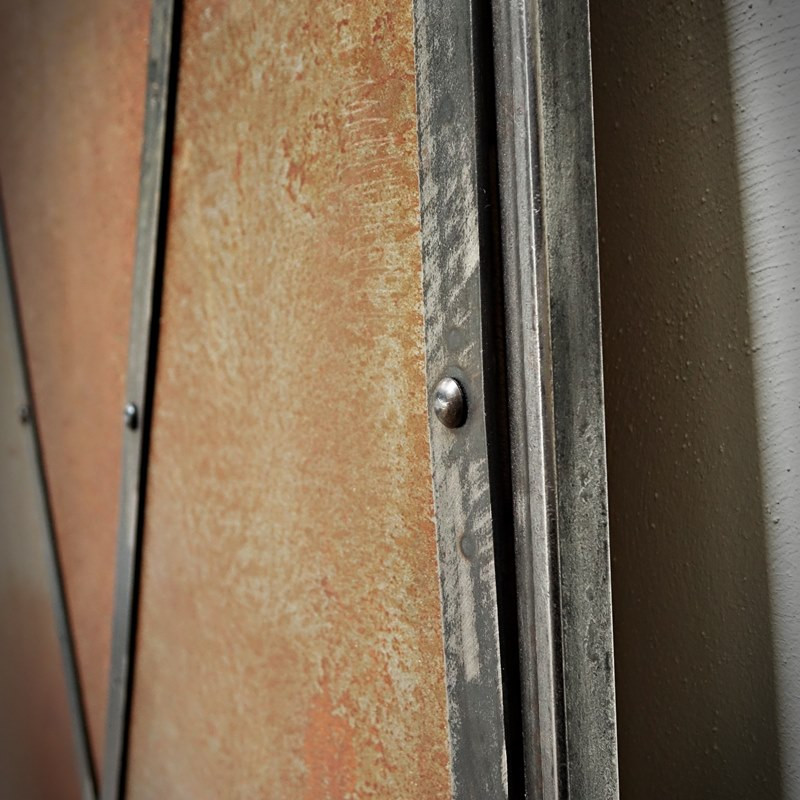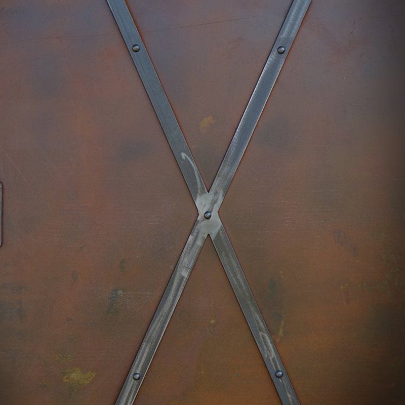 Rám posuvných dveří Rusty Metal tvoří uzavřený profil, do kterého je zasazena plechová deska. Celek je spojen plochými lištami ve tvaru písmene X, které jsou připevněny nýty. Ocelový rám tvořící konstrukci dveří a ploché lišty jsou v ocelové barvě s viditelnými svary a oděrkami, což zachovává surový charakter dveří. Vnitřní strana je vyplněna deskami, které byly namontovány mezi profily rámu.